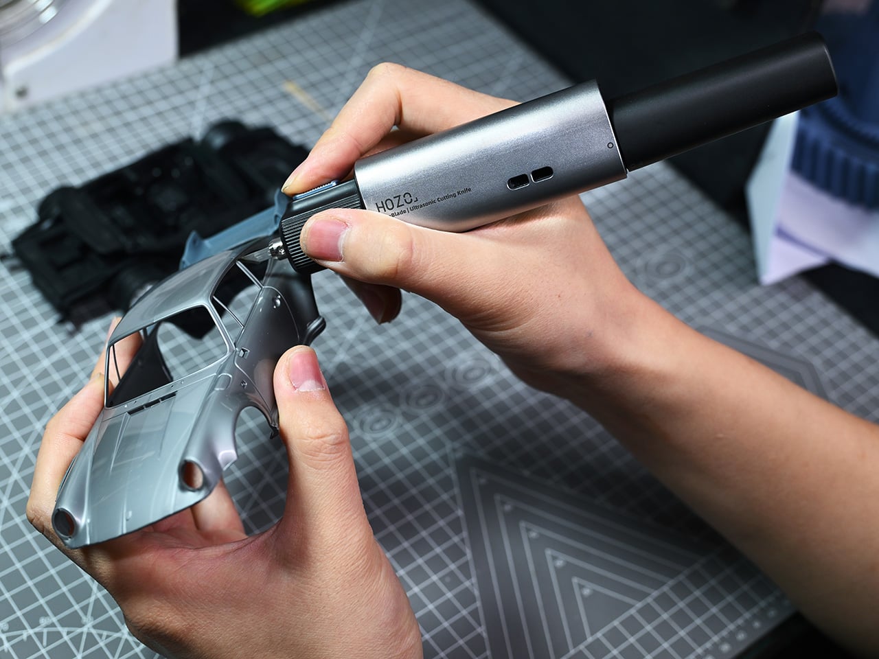 HOZO tiene dos modos de corte integrados en el mango: el modo de precisión actúa como un gatillo de sujeción para cortes cortos y controlados en piezas complejas, mientras que el modo continuo disminuye para cortes largos e ininterrumpidos. El sistema de cuchillas también merece atención. El NeoBlade viene con un juego de muestras de seis hojas que cubre perfiles estándar, largos, cincel, mini cincel, curvos y de doble filo, todos mecanizados en acero SK5 y duran de dos a tres veces más que las típicas hojas de acero al carbono para aficionados. Están montados magnéticamente para un intercambio rápido y la herramienta también acepta hojas estándar de 9 mm con un ángulo de 30 grados de marcas como OLFA si desea compatibilidad con una herramienta que ya posee. Un ventilador de refrigeración turbo de 13.000 RPM con dos puertos de escape mantiene estables las temperaturas internas incluso durante el uso intensivo, lo que soluciona una de las mayores debilidades de los diseños ultrasónicos más antiguos. HOZO también viene con un seguro para niños y cuenta con un cuerpo con diseño de flujo de aire ambidiestro para que pueda ser utilizado fácilmente tanto por usuarios diestros como zurdos. Para paquetes de vacaciones, HOZO ofrece un 25% de descuento en NeoBlade Combo y NeoBlade Premium Combo (también 25% de descuento), que agrega una estación de carga rápida de doble canal TurboDock y un paquete de batería adicional para profesionales que ejecutan proyectos consecutivos. Si solo necesita un NeoBlade independiente, HOZO ofrece primero un descuento del 20%.