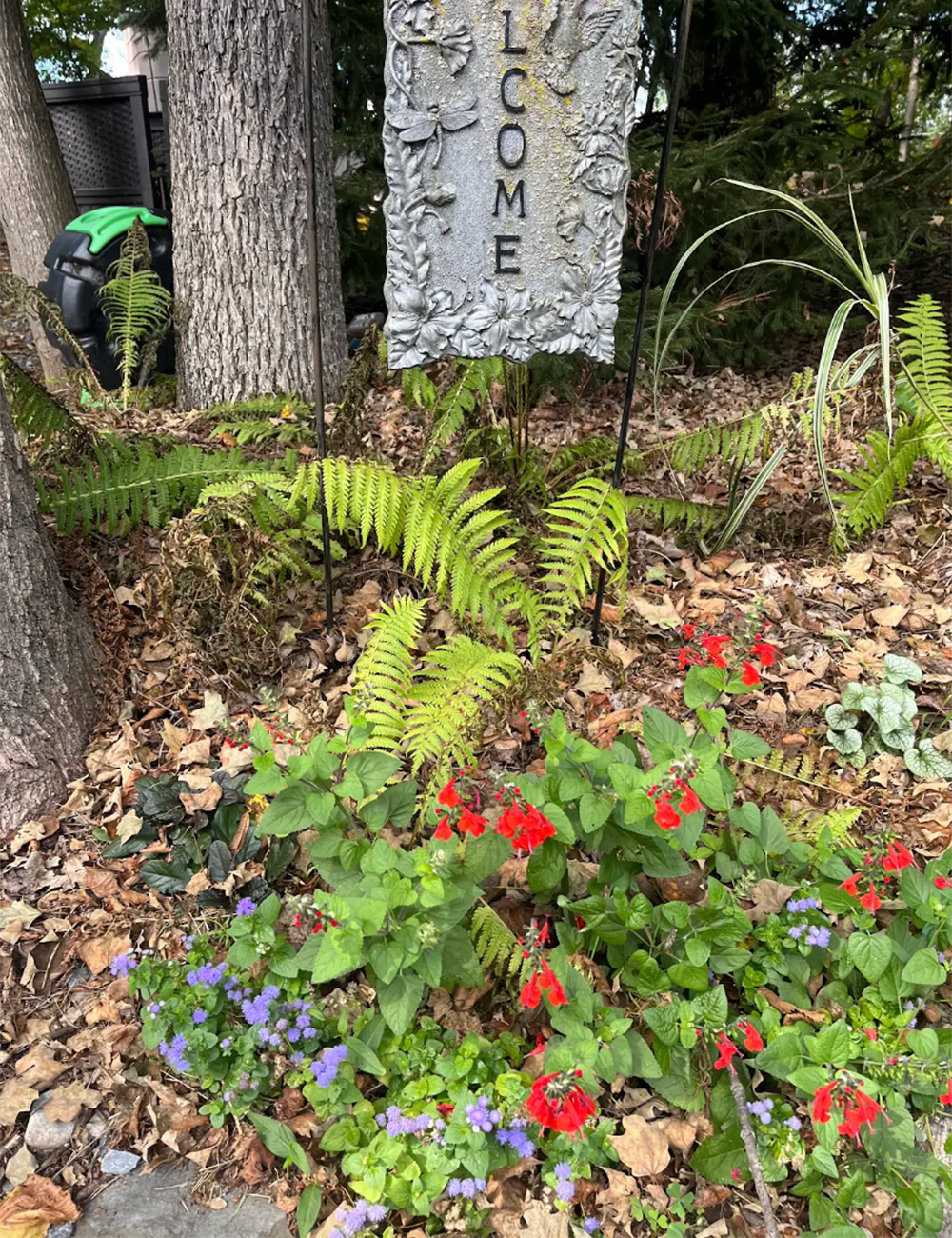 Salvia Colibrí (rojo salvia, Distritos 8-11 o anualmente) y ageratum se encuentran en el cartel de bienvenida en el área de estacionamiento para huéspedes.