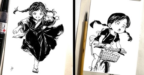 Pincel de tóner seco y pluma de tinta de línea fina historietas retrato.