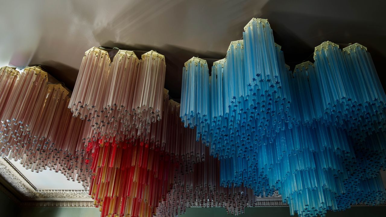 Silla Campanino 900 hermanos levaj Alrededor de la mesa Campeggio Dimoré Milano. Sobre la mesa hay un candelabro Antibes diseñado por Gio Ponti para Lino Sabattini en 1956. Lámpara de techo de cristal de Murano de Venini; arte de Markus Schinwald.