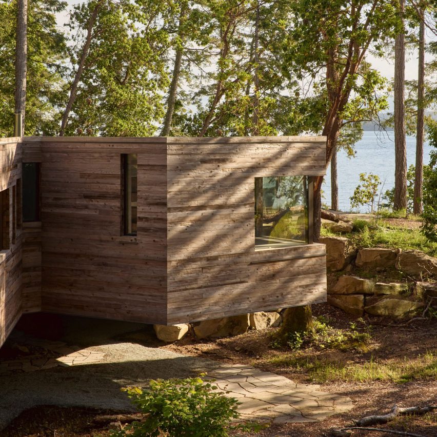 estudio canadiense La oficina de Omar Abel. Diseñado 91.0 cedro Los paneles de madera arenados de la casa “evocan” madera apilada, elevándola por encima del barranco. playa propiedad en columbia británica.
