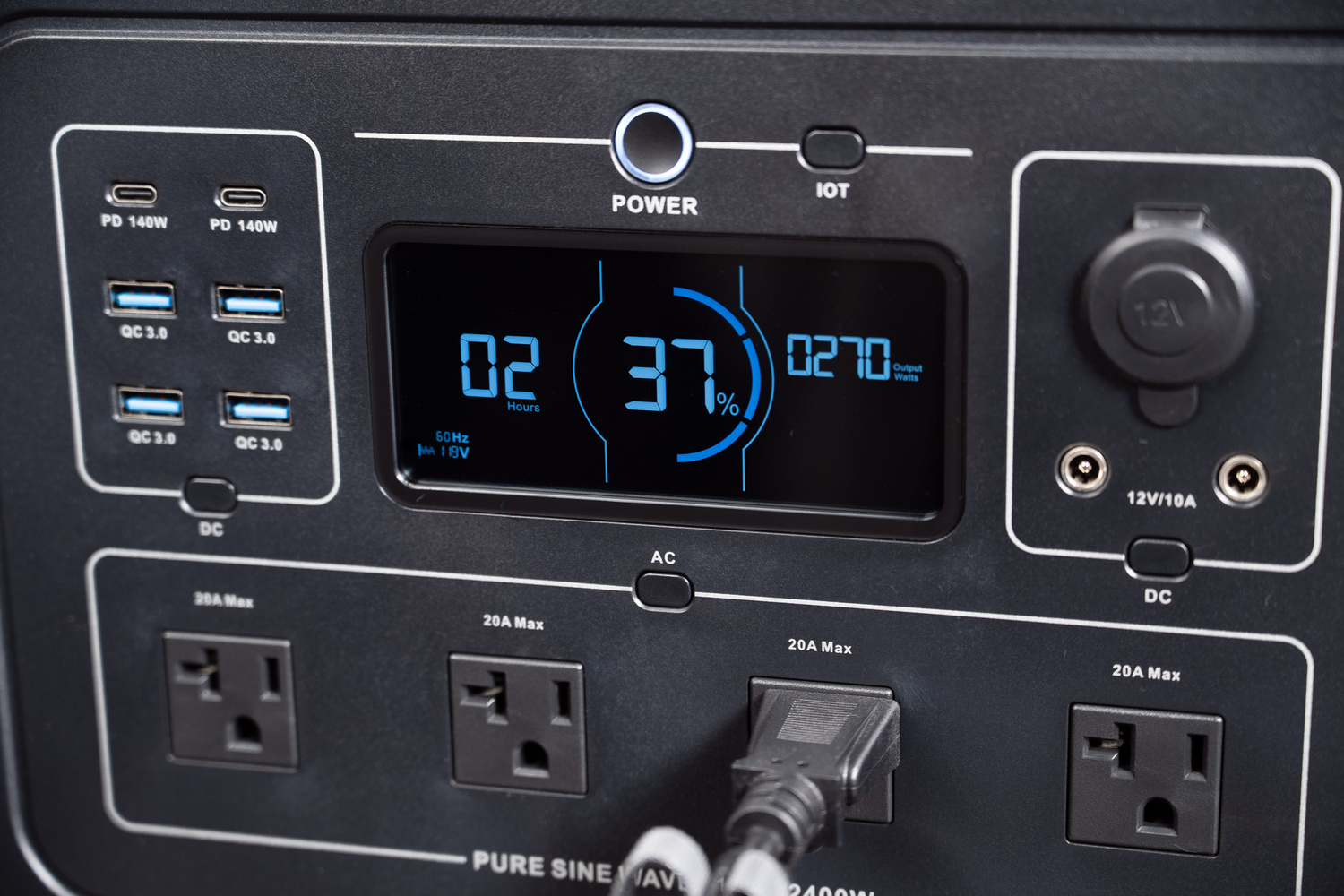 La unidad OUPES tiene una potencia nominal de 2400 vatios a través de un inversor de onda sinusoidal pura. Eso es suficiente para manejar electrodomésticos que consumen mucha energía, como luces continuas de alto rendimiento y múltiples electrodomésticos al mismo tiempo, con cada tomacorriente en el frente clasificado para un máximo de 20 amperios. Para momentos de alta demanda, puede manejar hasta 2600 vatios de potencia en modo boost, así como 4500 vatios de potencia de sobretensión.