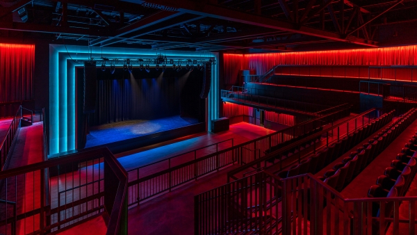 El balcón escalonado se extiende 35 pies hacia la habitación. Las plataformas laterales muy inclinadas acercan al público al escenario manteniendo una línea de visión clara.