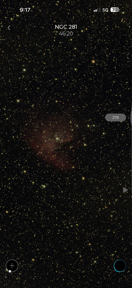 Después de alcanzar el objetivo, el software comenzará a tomar imágenes, 10 segundos a la vez. Las imágenes que toma se acumulan automáticamente para que, a medida que la vea, se vuelva más brillante y detallada. Esta es la “Nebulosa Pac-Man” menos de 5 minutos después. Hay una imagen terminada más adelante en mi reseña.