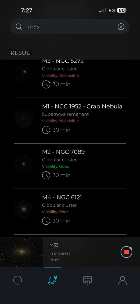 A partir de ahí, estás listo para comenzar. Su aplicación le sugerirá algunos objetivos o podrá explorar más a fondo. El software también te indica si el objetivo está en una buena posición y recomienda tiempos de exposición. Los tiempos sugeridos me parecen conservadores. Querrás recolectar tantos fotones como sea posible. Cuando la imagen sea de su agrado, puede detenerse y Vespera II procesará la imagen por usted.
