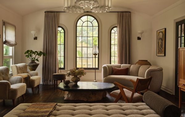 La sala de estar tiene una sensación de luminosidad y tranquilidad, con paredes color crema y pisos de concreto que resaltan las formas de los muebles. Los sofás curvos y las lujosas sillas en suaves tonos caramelo y canela aportan calidez, mientras que las alfombras en capas, los elementos de madera y las mesas auxiliares esculturales añaden una textura sutil, y las obras de arte de gran tamaño añaden sutiles toques de color.