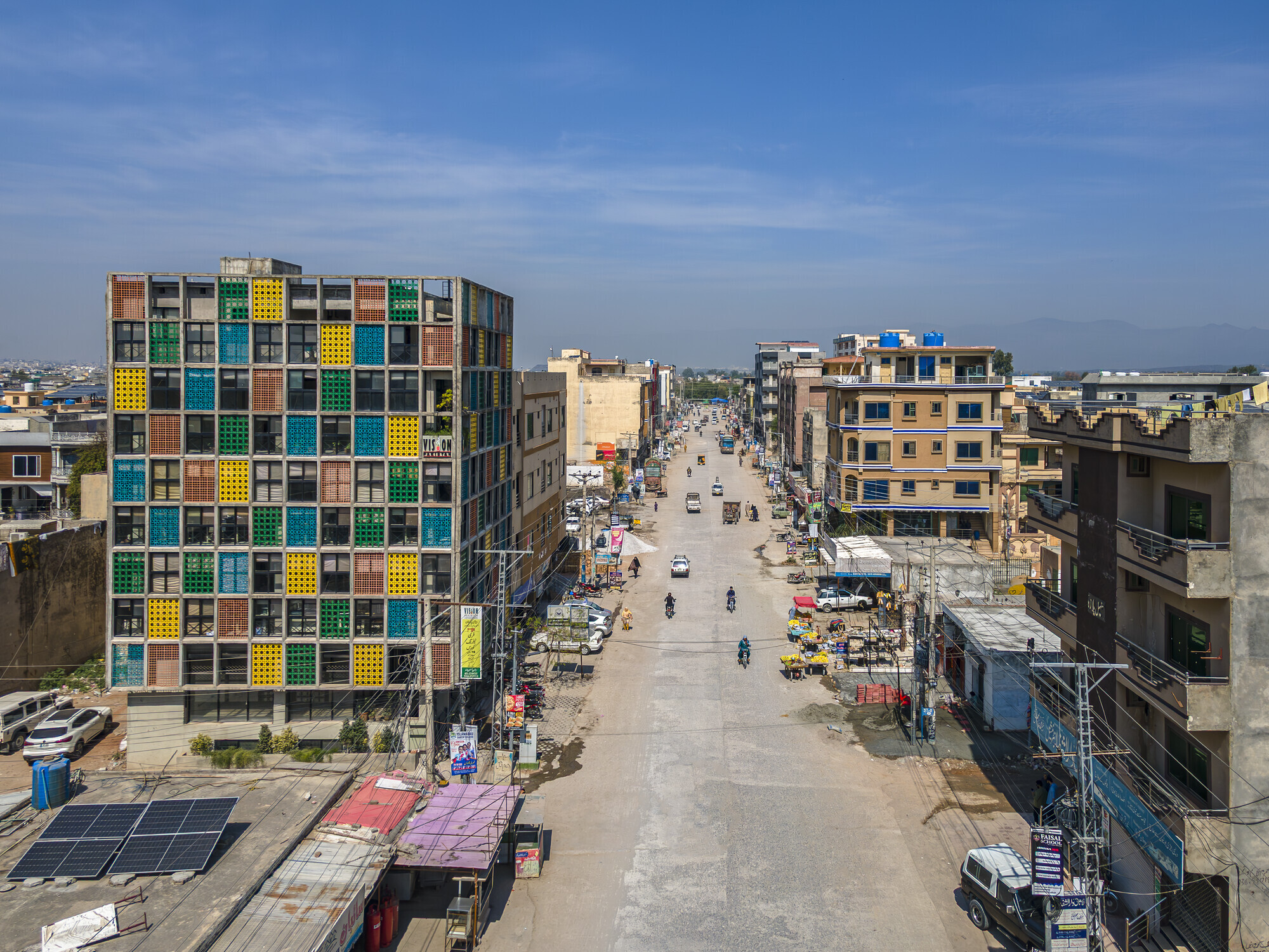 El sitio está ubicado en una parcela de esquina de 130 m2 en Ghauri Road, en un entorno periurbano denso e informal con plazas de uso mixto, casas pequeñas, vendedores ambulantes y arquitectura ecléctica. El edificio aprovecha al máximo el volumen permitido, utilizando un núcleo vertical central que permite que cada piso funcione de forma independiente para generar ingresos. Las plantas baja y alta contienen locales comerciales y espacio expositivo alquilable, así como aparcamiento. Las plantas superiores albergan aulas (ubicadas en el lado este para aprovechar la luz y ventilación natural), oficinas, aseos, salas polivalentes y un atrio de tres plantas con un gran árbol que mejora la ventilación y la unidad del conjunto.