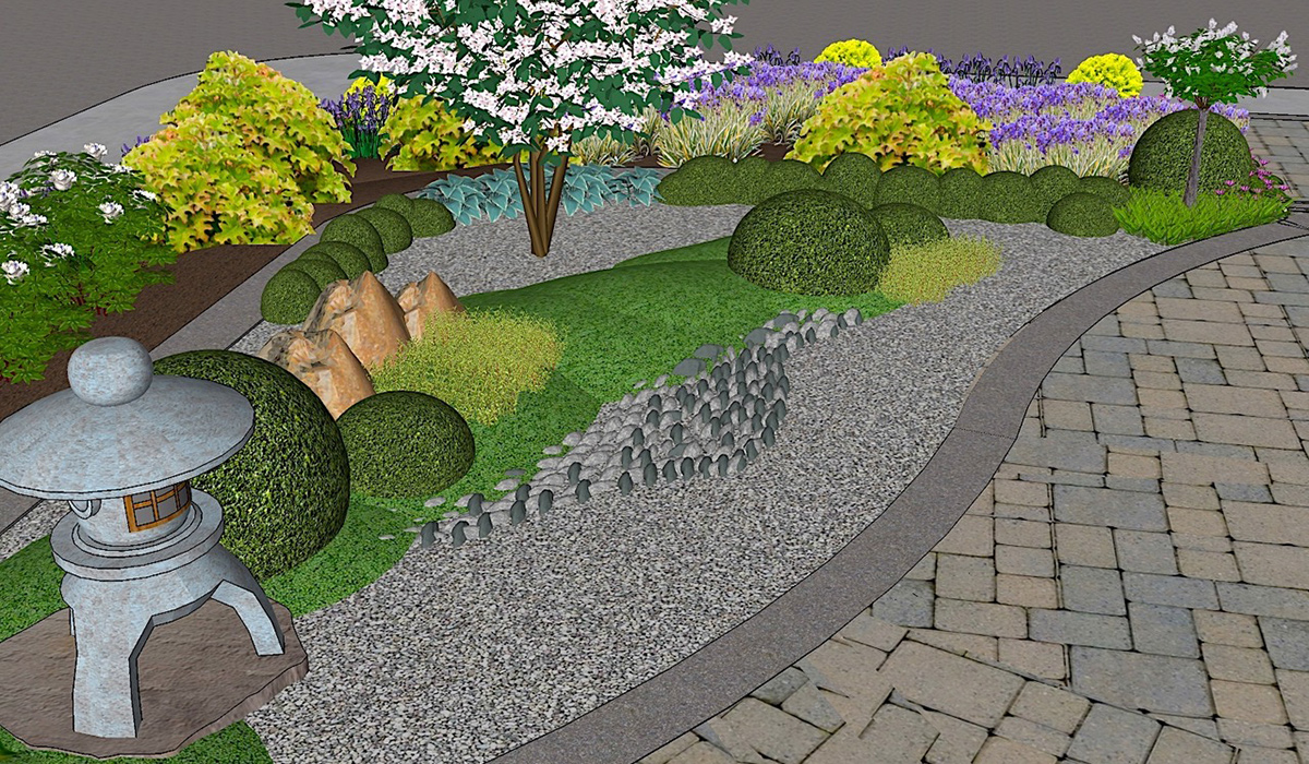 Modelo de cama de jardín de gravaModelo 3D de la “isla” propuesta con linternas, cubierta vegetal perenne, guijarros y lavadero de río de 3/8 de pulgada. Hay algunos arbustos de boj alrededor. Mirando desde la distancia, hay coloridas flores de iris. Hortensia de hoja de roble (hortensia de muérdago, Zonas 5 a 9), peonías y macollos amarillos..