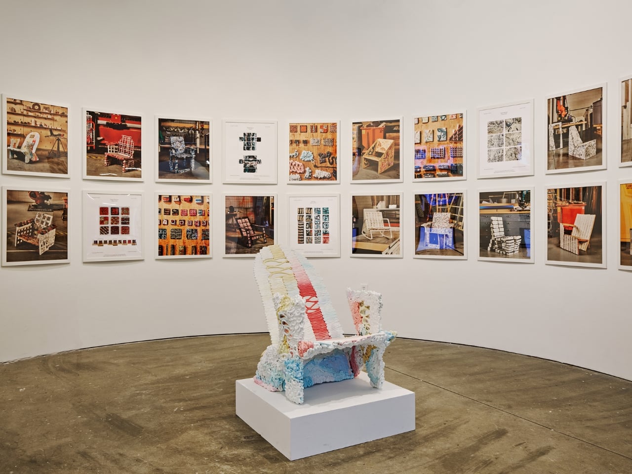 Cada pieza tiene un nombre y personalidad. Vincent tiene forma de mano y superficie de mármol. La silla Modu-Chair está hecha de módulos cúbicos que hacen eco del patrón acolchado. Framework es una estructura de celosía translúcida que reinventa el aspecto de una silla Adirondack. Cada uno hace la misma pregunta de forma diferente: ¿Qué pasaría si dejáramos de ver el plástico como basura y empezáramos a verlo como algo potencial?
