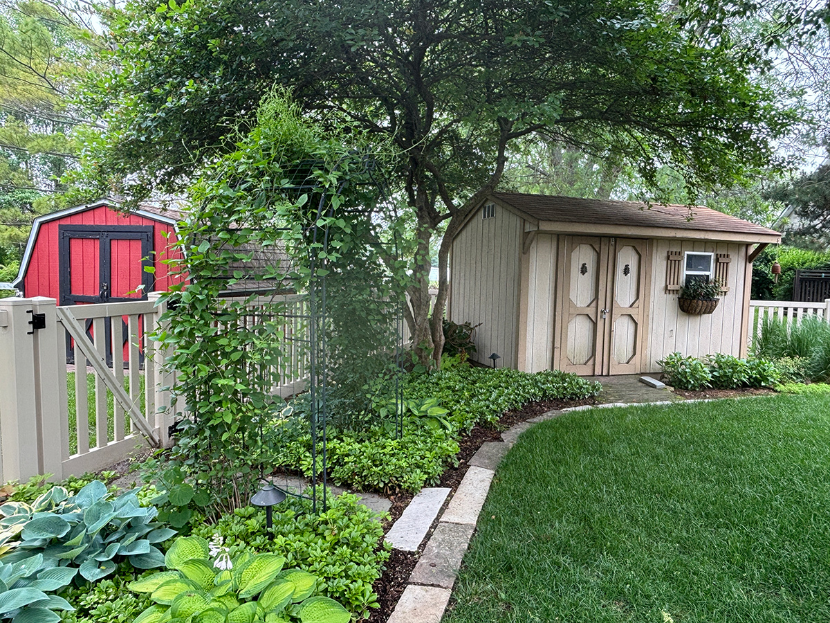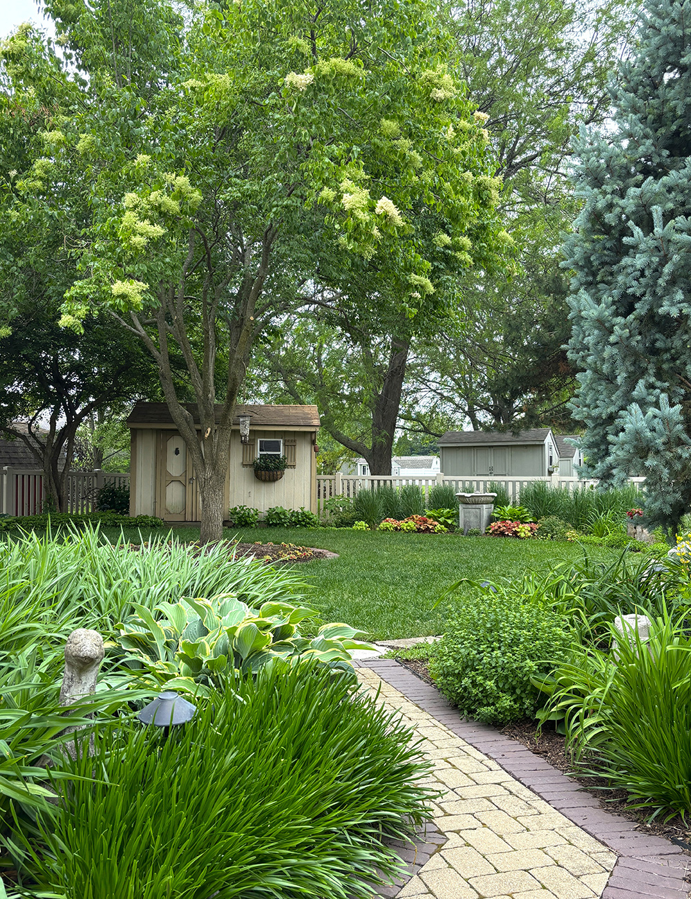 John eligió una impresionante paleta botánica que tiene una amplia gama de intereses, pero también creó diseños tranquilos y cohesivos. El borde curvo continuo alrededor de la cerca del patio trasero proporciona un camino fácil para la vista, pero la impresionante Lila China Summer Charm® (jeringuilla pekinensis “DTR 124”, zonas 3-7) destaca como foco central.