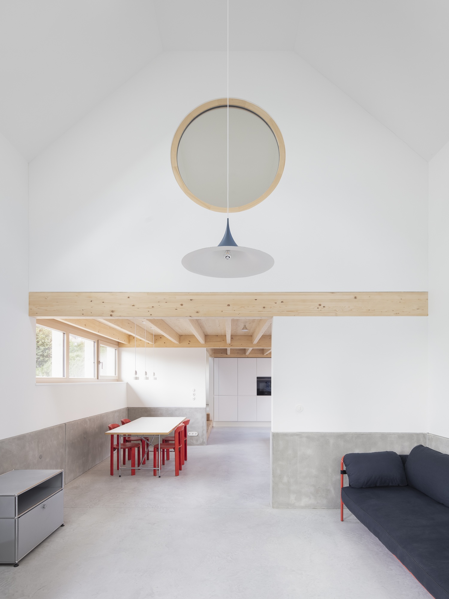 La composición del edificio se divide en dos elementos distintos que establecen la conexión a tierra y brindan refugio. La base revestida de madera de una sola capa parece un zócalo, con sus tablones verticales creando ritmo y textura al nivel de la calle. Arriba, un volumen de techo en voladizo revestido con metal plateado con juntas alzadas muestra una sensación de ligereza a pesar de su gran escala, con superficies reflectantes que responden a los cambios de luz natural y condiciones climáticas. Esta separación de base y corona recuerda la tradición tectónica del modernismo alemán, mientras que el borde occidental redondeado introduce una suavidad escultórica que reconoce la intersección angular de las calles sin recurrir a una geometría radical. Los aleros continuos crean una transición suave entre esta forma redondeada y el tejido urbano, mientras que la superficie enlucida y la entrada saliente de la fachada este proporcionan una dirección más tradicional a los edificios residenciales vecinos.