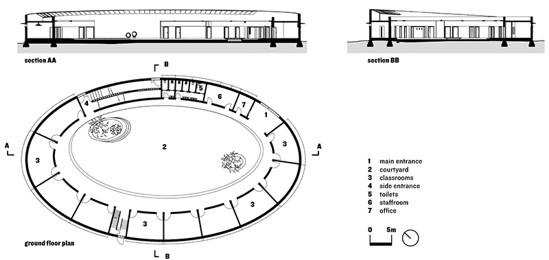 En cuanto a la forma del edificio, cabe señalar que geometría elípticano sólo con fines estéticos, sino principalmente con fines climáticos. Por lo tanto, se genera naturalmente un flujo de aire favorable debido a la circulación perimetral y los patios internos.