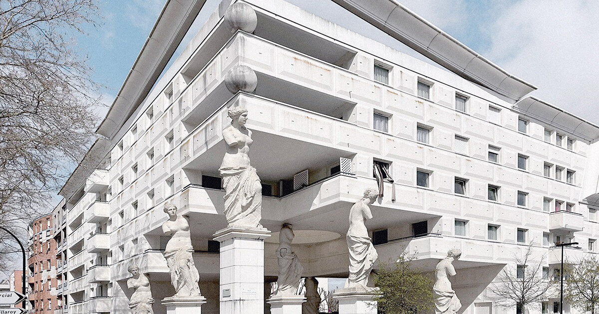 La fachada rígida y modular del edificio está salpicada de ventanas cuadradas y paneles empotrados, y la columnata alberga imponentes esculturas que son réplicas monumentales de la Venus de Milo, un símbolo cortado de la antigüedad. Cada Venus está representada en proporciones exageradas y colocada sobre un pedestal de gran tamaño, elevándolas de obras de arte a objetos arquitectónicos de carga. Tienen una superestructura residencial como un atlas posmoderno, serena, idealizada, surrealista. Las figuras miran hacia afuera, indiferentes al peso de arriba o al tráfico de abajo, y están envueltas en cortinas fluidas que hacen eco de sus orígenes clásicos. Los brazos que les faltan, un sello distintivo de las esculturas originales, no han sido corregidos, lo que realza la sensación de ironía dramática.