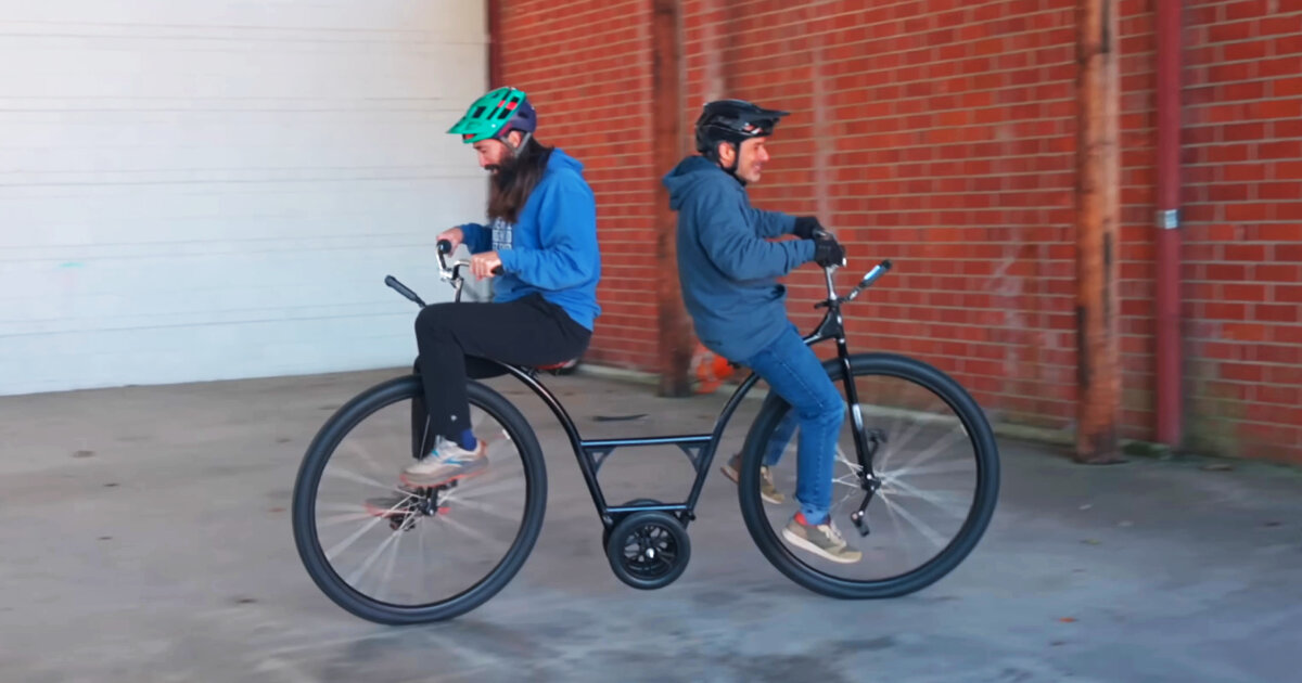 El creador de contenido Seth Alvo suelda dos centavos en serie bicicleta Permite que dos ciclistas pedaleen al mismo tiempo. Básicamente, un paseo personalizado es exactamente lo que su nombre implica: dos bicicletas idénticas de ruedas altas unidas sobre un marco, orientadas en direcciones opuestas. Cada lado tiene su propia rueda motriz grande, pedales conectados directamente a esa rueda, manillar y sillín. El resultado es un vehículo sin una parte delantera o trasera clara, cualquiera de los conductores puede ser el piloto, el movimiento hacia adelante puede ocurrir en cualquier dirección y la dirección puede provenir de ambos extremos al mismo tiempo.