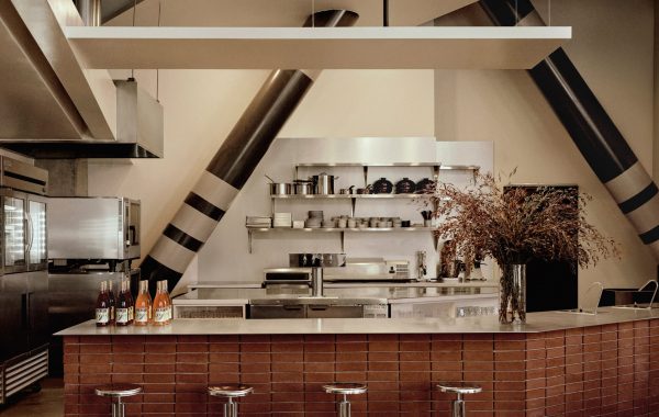 La cocina, por su parte, está ubicada junto a la estructura central, con gabinetes en suaves tonos metálicos y realzados con herrajes azules. Una columna estructural pintada en el mismo naranja que la estructura de acero atraviesa la isla de la cocina, conectando visualmente el elemento arquitectónico fijo con el volumen insertado.