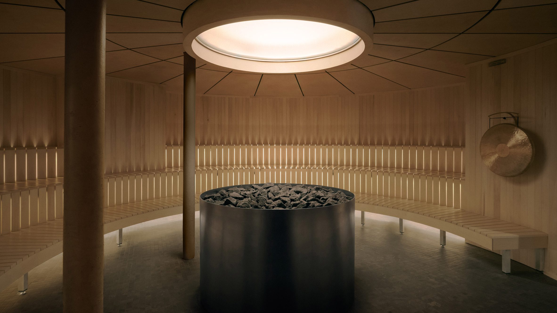 La sauna en sí es circular, con carbón contenido en un tambor cilíndrico central y asientos de listones de madera dispuestos a su alrededor.