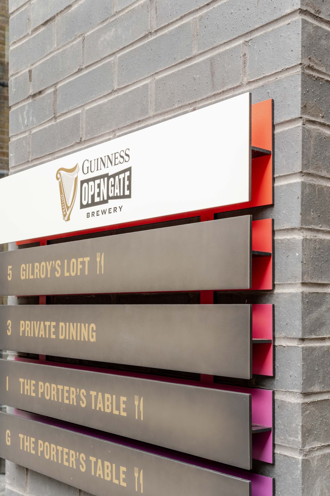 Externamente, la señalización está inspirada en el símbolo Guinness más emblemático: la pinta perfectamente servida. Un panel de catálogo negro mate con un “encabezado” blanco transparente en la parte superior que también funciona como herramienta de navegación y momento de marca. Las sutiles gradaciones de color debajo de la superficie hacen referencia a la identidad de cada edificio, mientras que los rastros de letreros pintados a mano, flechas negras audaces y arpas doradas guían a los visitantes a través del sitio.