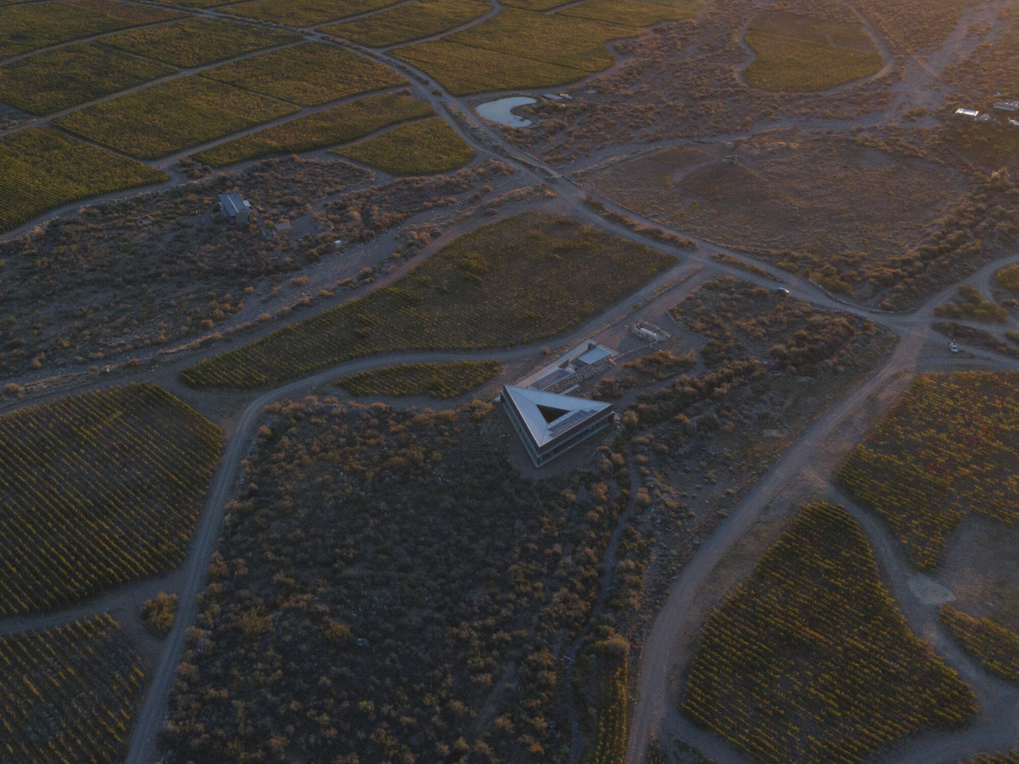 El concepto arquitectónico surge de una forma puramente geométrica: el triángulo. Sus tres lados encapsulan los pilares narrativos del proyecto –montañas, agua y creación– en diálogo con las montañas del fondo y los canales aluviales que definen la tierra. La bodega se estableció sin interferir con la flora nativa, manteniendo la topografía original y conservando el carácter ambiental árido de la zona.