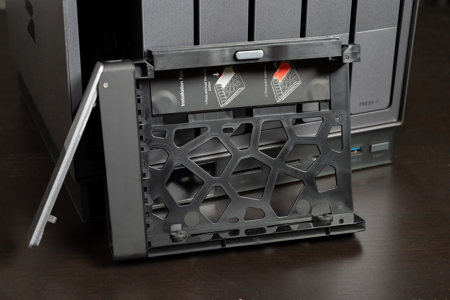 Lo primero que me llamó la atención del D6 fue lo refinado que era el hardware. El chasis es sólido y pesado, y se utilizan materiales de alta calidad en todas partes. La caja de unidades es sin duda la mejor que he usado en cualquier producto (NAS o de escritorio). Se deslizan suavemente, se sienten resistentes y no requieren herramientas gracias a un práctico botón de bloqueo. Incluso el filtro de polvo es un panel metálico resistente y perforado en lugar del material de malla endeble típico de las carcasas de las computadoras.