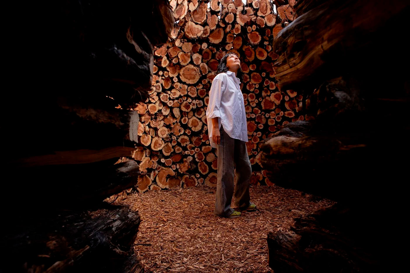 Dentro del círculo hay un vacío de tres metros de diámetro, definido por troncos de árboles segmentados que se elevan para formar una pequeña bóveda. En lo alto, un punto de luz atravesó la madera carbonizada y delineó fragmentos de cielo.