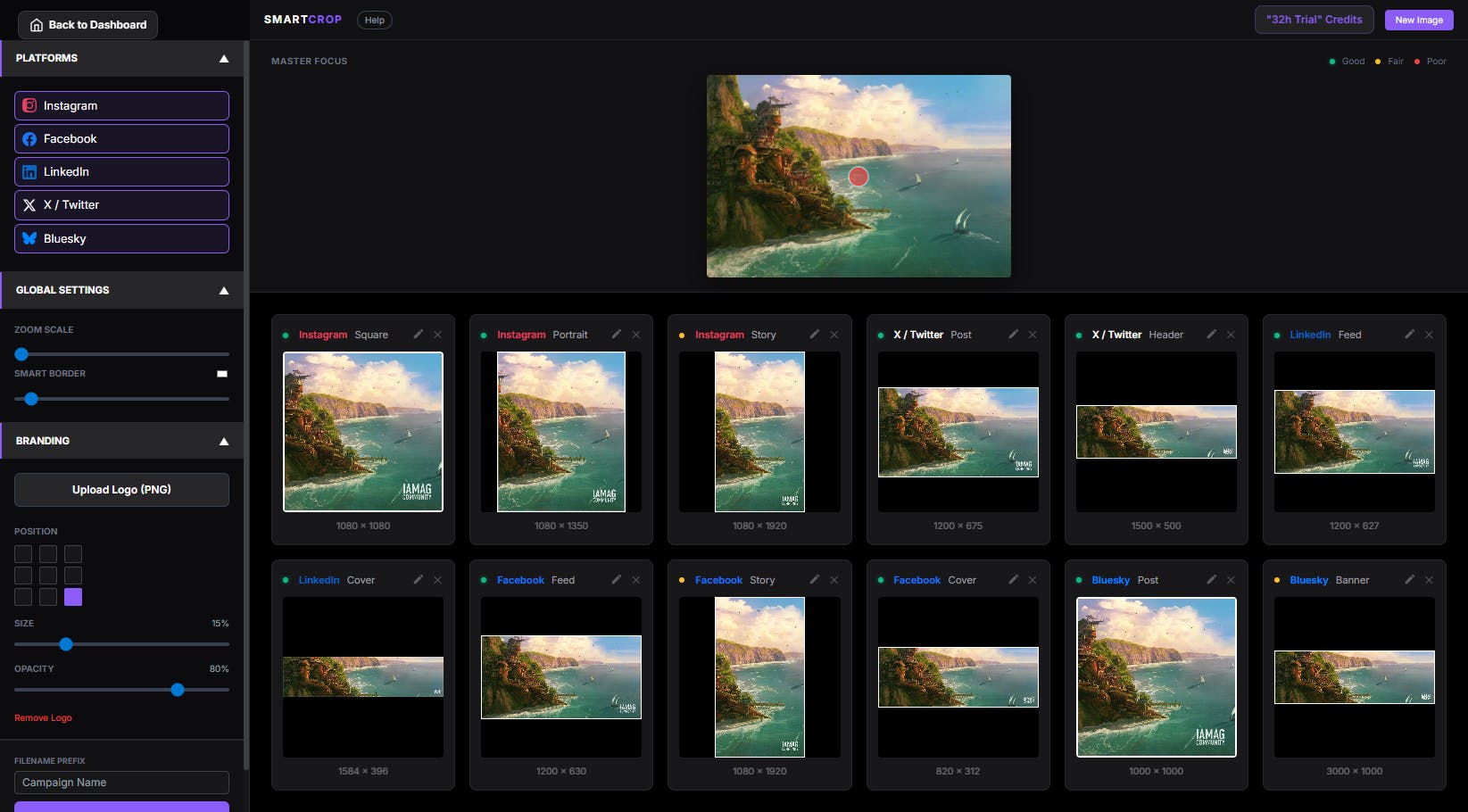 Simplemente lo hacemos más rápido. La herramienta de recorte inteligente tiene una nueva actualización: ahora puede agregar marcos elegantes y cubrir automáticamente su logotipo en todos los tamaños de miniaturas.