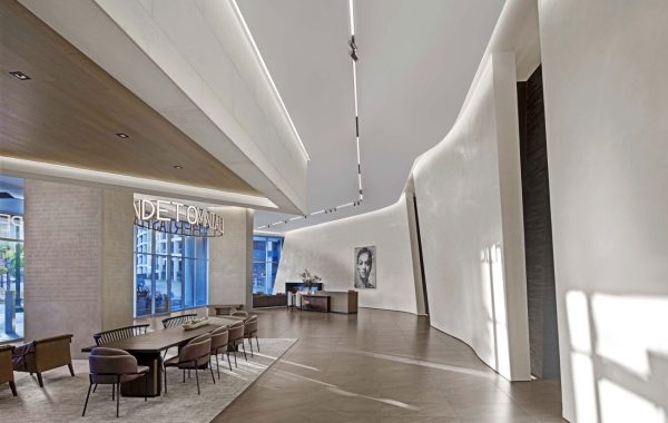 El proyecto se concibe como un complejo de volúmenes interconectados más que como un monolito. El sistema de muro cortina utiliza paneles de vidrio especialmente tratados de diferentes tonalidades que reflejan y distorsionan el cielo.