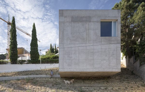 La integración entre los dos cuerpos se realiza a través de una amplia placa inferior, un elemento horizontal que conecta los volúmenes, define los recorridos y establece una escala intermedia entre el edificio y el paisaje. Bajo esta losa se configura un espacio de transición, protegido y permeable, que alberga usos cotidianos como sala de televisión y zona de estar. Este plano es más que una simple conexión, es un espacio permanente donde el interior y el exterior se fusionan en una experiencia continua.