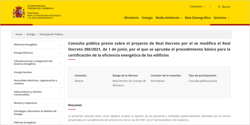 Ministerio de Transición Ecológica y Retos Demográficos (Mitko) ha iniciado una consulta pública previa sobre el proyecto de Real Decreto por el que se modifica el Real Decreto 390/2021, de 1 de junio, por el que se aprueban los procedimientos básicos para la certificación de eficiencia energética de los edificios. Los cambios tienen como objetivo adaptar el sistema nacional de certificación energética de edificios al nuevo marco europeo, facilitar las reparaciones y aumentar la transparencia. La fecha límite para presentar cargos es el 6 de febrero de 2026.
