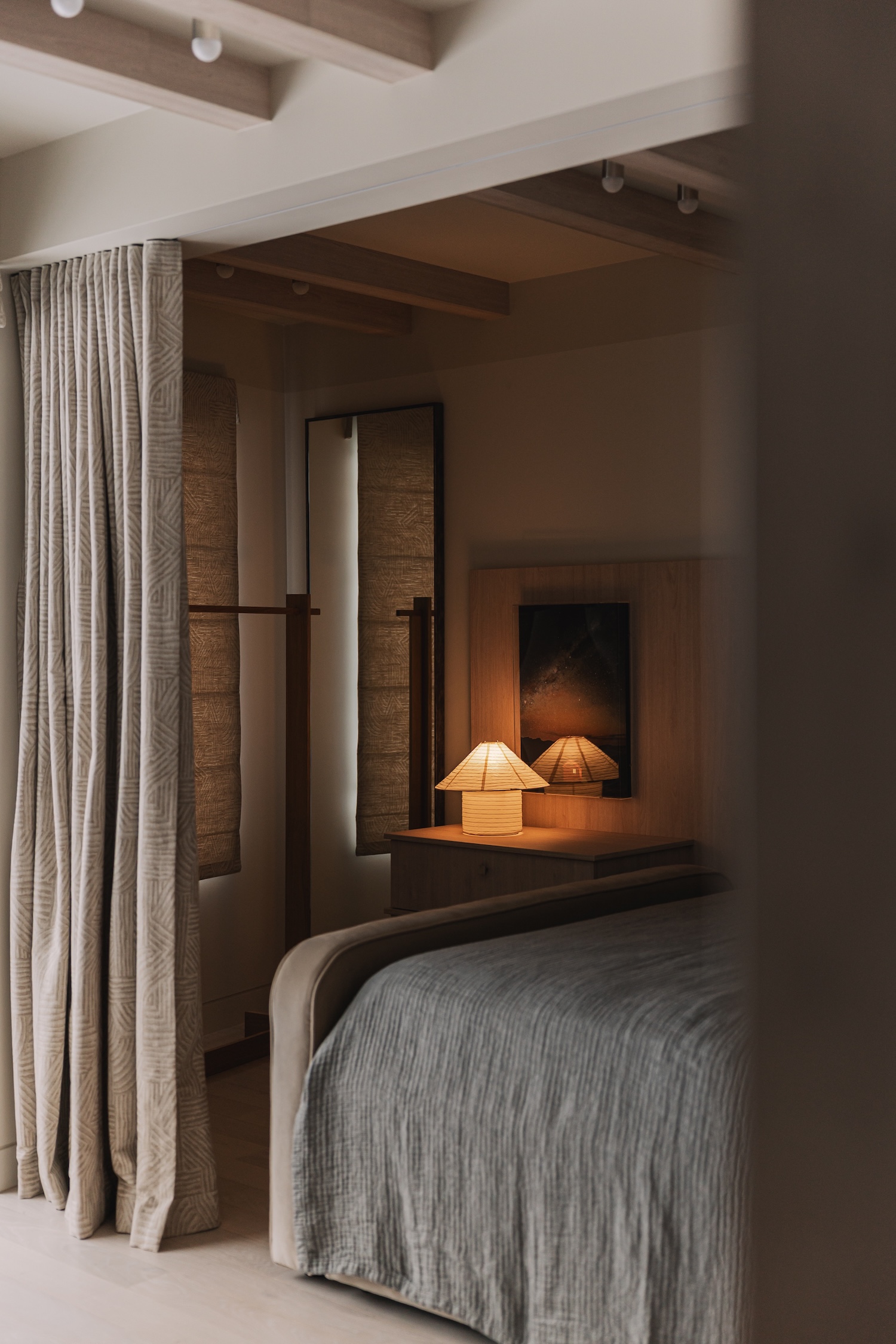 La capa de hardware revela la intersección de las tradiciones artesanales y la producción contemporánea. Tiradores y tiradores de bronce reciclado, cuyas superficies presentan una pátina irregular procedente del material reciclado, realzan los planos de carpintería con detalles escultóricos. Este enfoque de ver el hardware como pequeñas esculturas en lugar de necesidades utilitarias se vincula con una sensibilidad de diseño australiano más amplia vista en estudios como Apparatus o Dowel Jones, donde los objetos funcionales tienen una intención artística. La contribución de los alfareros locales a los accesorios de iluminación extiende el concepto verticalmente, y las irregularidades de su artesanía lo suavizan sin comprometer la precisión arquitectónica.