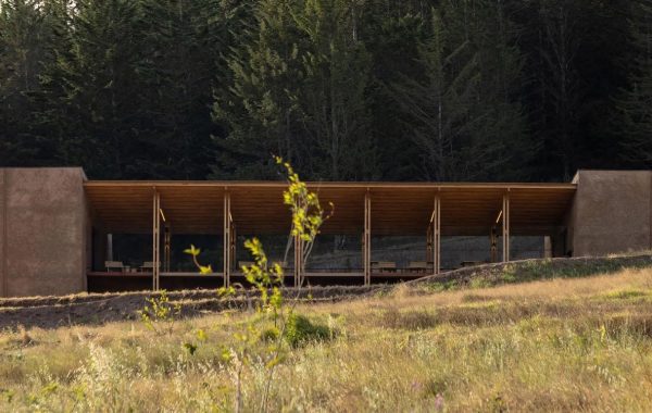 Una valla de madera en el borde del sitio forma la parte trasera de la zona de espera, que está construida a partir de cuatro soportes de madera delgados que se asientan sobre hormigón y piedra.