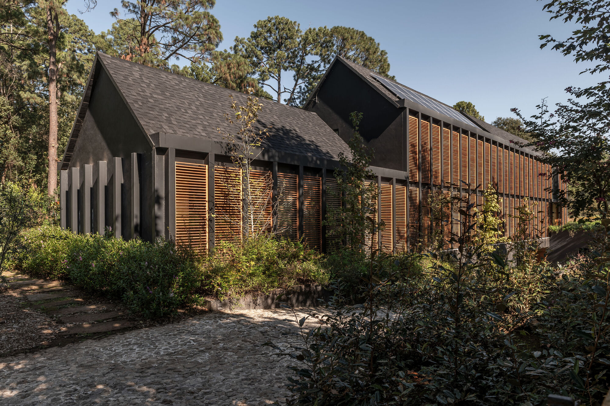 La materialidad se mantiene sobria, con tonos oscuros y cálidos contrastes creados a través de las celosías de madera, permitiendo que el proyecto se mimetice con el paisaje. Se utilizan pocos elementos cuidadosamente elegidos para construir el espacio: estructura, sombra, textura y luz. El tejado a dos aguas también es decisivo desde el punto de vista técnico. Se exploraron opciones de eficiencia estructural utilizando madera del sitio, formando una envolvente térmica que, además de su desempeño, brinda una presencia estética clara y atemporal.