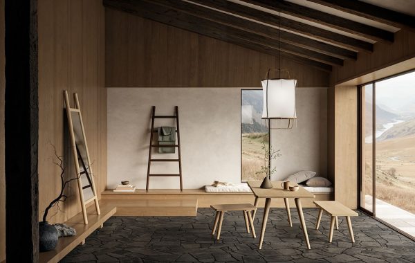 Internamente, los pisos de cemento en tonos claros crean una sensación de continuidad con estas terrazas, ayudando a maximizar la percepción de la luz en el espacio relativamente bajo, completo con techos revestidos de tablones de cedro.