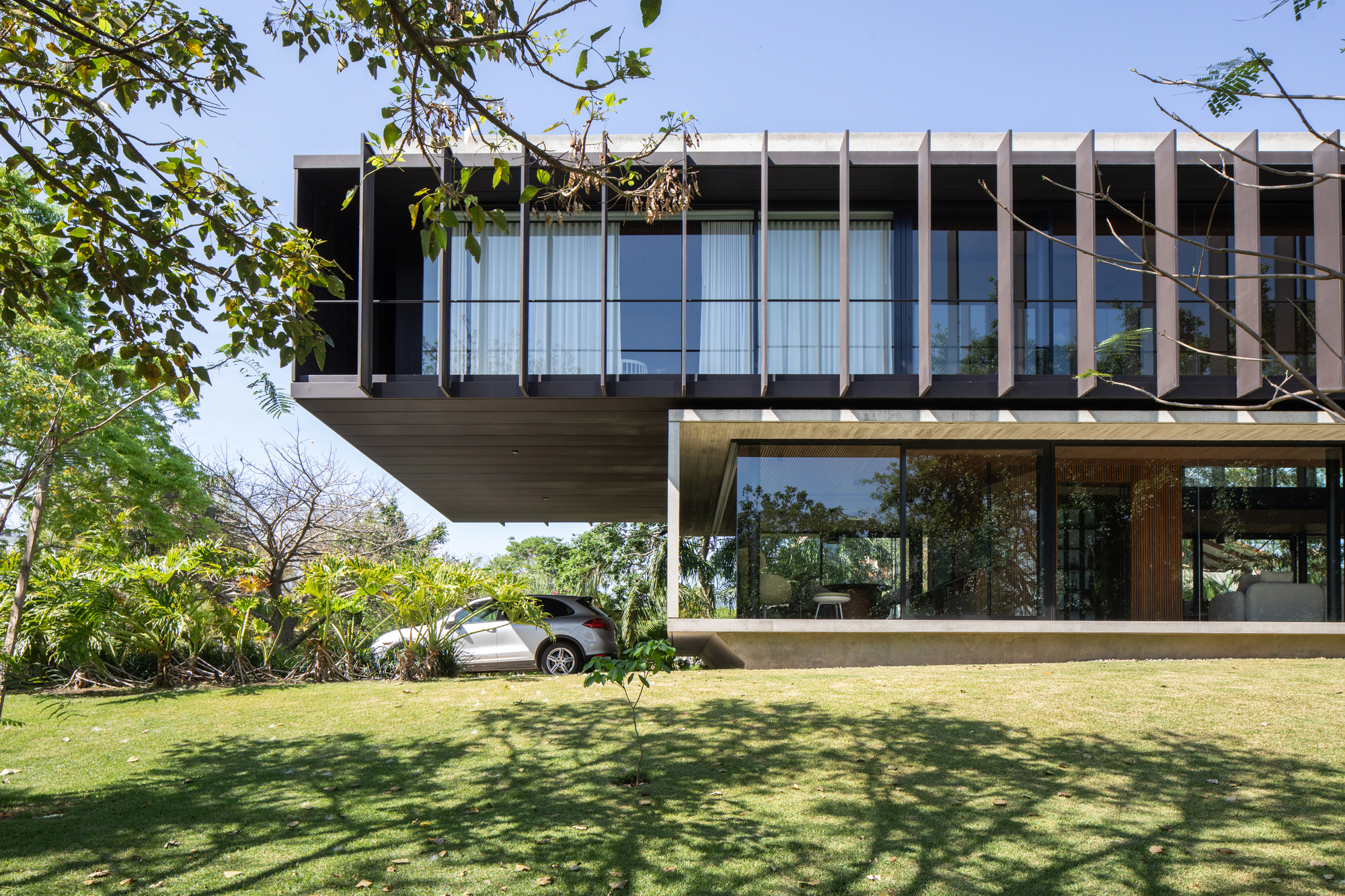 A lo largo de la fachada longitudinal, la casa cuenta con sombrillas metálicas que responden a la dirección del sol y regulan la luz solar. AS House se adapta a la topografía existente con la mínima intervención, reteniendo los árboles del terreno e integrándolos como parte activa del edificio.
