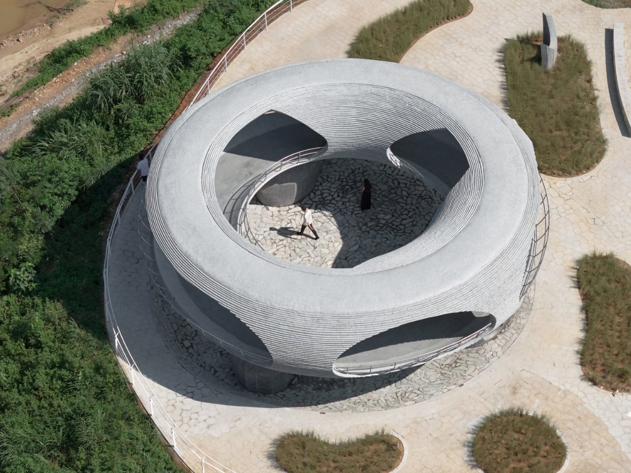 La estructura en sí es un anillo continuo de hormigón cuya textura imita el bambú, creando este fascinante viaje circular. Entras, sigues el camino sinuoso hacia arriba y, finalmente, regresas al punto de partida. Pero no eres tú quien entró. Porque a lo largo del camino, aberturas ovaladas estratégicamente ubicadas enmarcan las montañas y el río como pinturas vivientes.