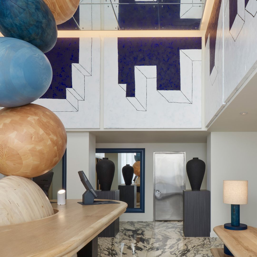 por encargo muebles El vestíbulo también presenta obras y pequeñas esculturas de Hendzel, incluido un mostrador de registro ovalado que rodea la escultura central y coloridos bancos de madera adyacentes a la declaración. lámpara.