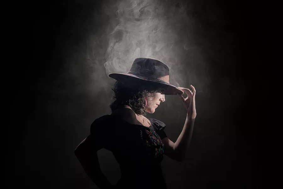 Este retrato es bastante Crear deliberadamente la sensación de una escena de película. El sujeto aquí está mayoritariamente en la sombra, esculpido por un rayo de luz y rodeado por una niebla a la deriva. El ala oculta los ojos, por lo que la historia se cuenta a través de los contornos del rostro, las curvas de los brazos y la postura. Se trata de siluetas y misterio.