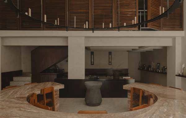 La sala minimalista, amueblada con taburetes de madera y esculturas de madera flotante, está iluminada por un aplique de pared hexagonal y una lámpara de pie con tres pantallas en forma de pirámide.