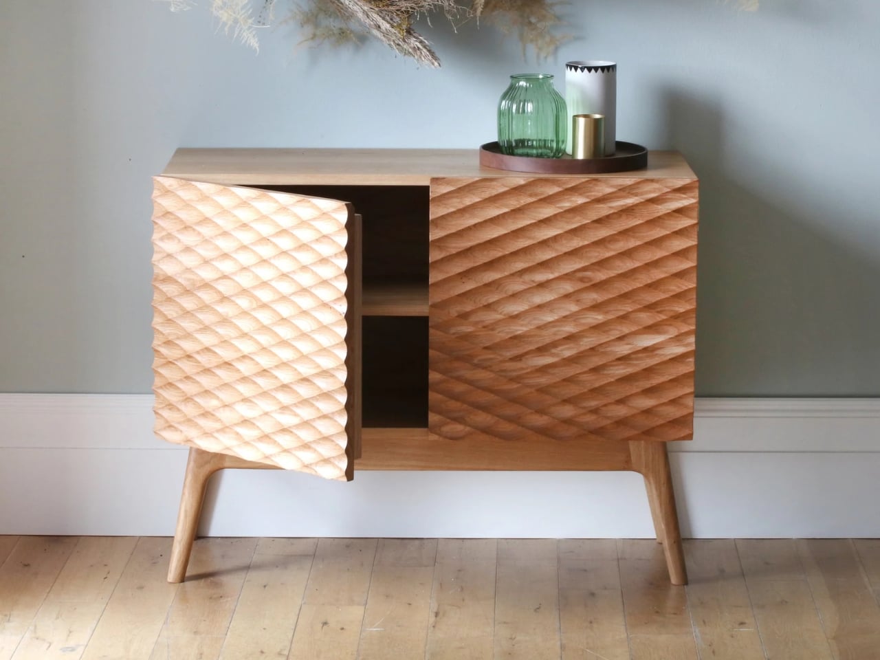 A primera vista parece un aparador de roble macizo. Líneas limpias, proporciones clásicas, nada demasiado llamativo. Pero a medida que te acercas, te das cuenta de que esas puertas son más que simples puertas. Están talladas con patrones fluidos en forma de ondas, convirtiendo una superficie plana en algo casi dinámico. El tallado revela la veta del roble de una manera que nunca antes habías visto, creando sombras y profundidad que cambian a medida que te mueves por la pieza.