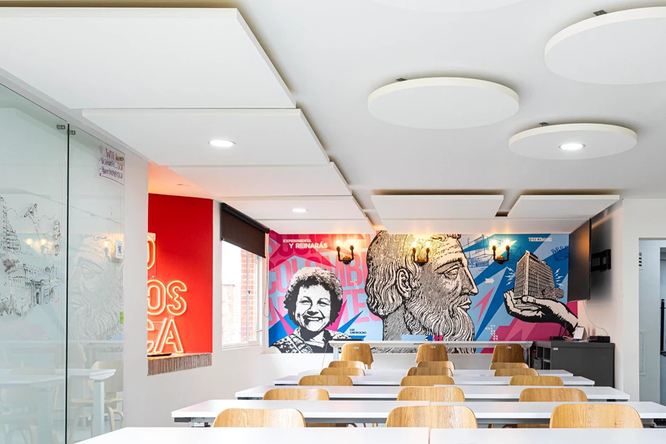 Destacando su uso en ambientes interiores, paneles acústicos. Anillo Ecophon Solo™ está instalado en La oficina del pecador Schrader Diseñado por Kurz Architekti y ubicado en Praga, República Checa. Ante un espacio atípico con grandes lucernarios, el entorno de oficina requería soluciones acústicas de alta calidad. Para apoyar la creatividad de los empleados, se crearon espacios singulares dentro del antiguo Instituto del Vehículo a Motor y se respetó el orden y la estructura del edificio, enfatizando su carácter industrial. Otro ejemplo de aplicación de estos paneles es en Oficina de automóviles Skoda Diseñado por Vlastimil Pacek pero en este caso combinado con otras soluciones como solo cuadradoRectángulo Solo, Deflector Solo y Matriz Solo. también, Despacho Instituto Colombiano de Arquitectos Bogotá también está equipada con las soluciones acústicas Saint-Gobain Ecophon, que utilizan Solo™ y Focus™ B para reducir el ruido. El nuevo espacio de coworking en el piso 10 tiene un tiempo de reverberación de 0,4 segundos, parámetro en función del volumen del espacio.
