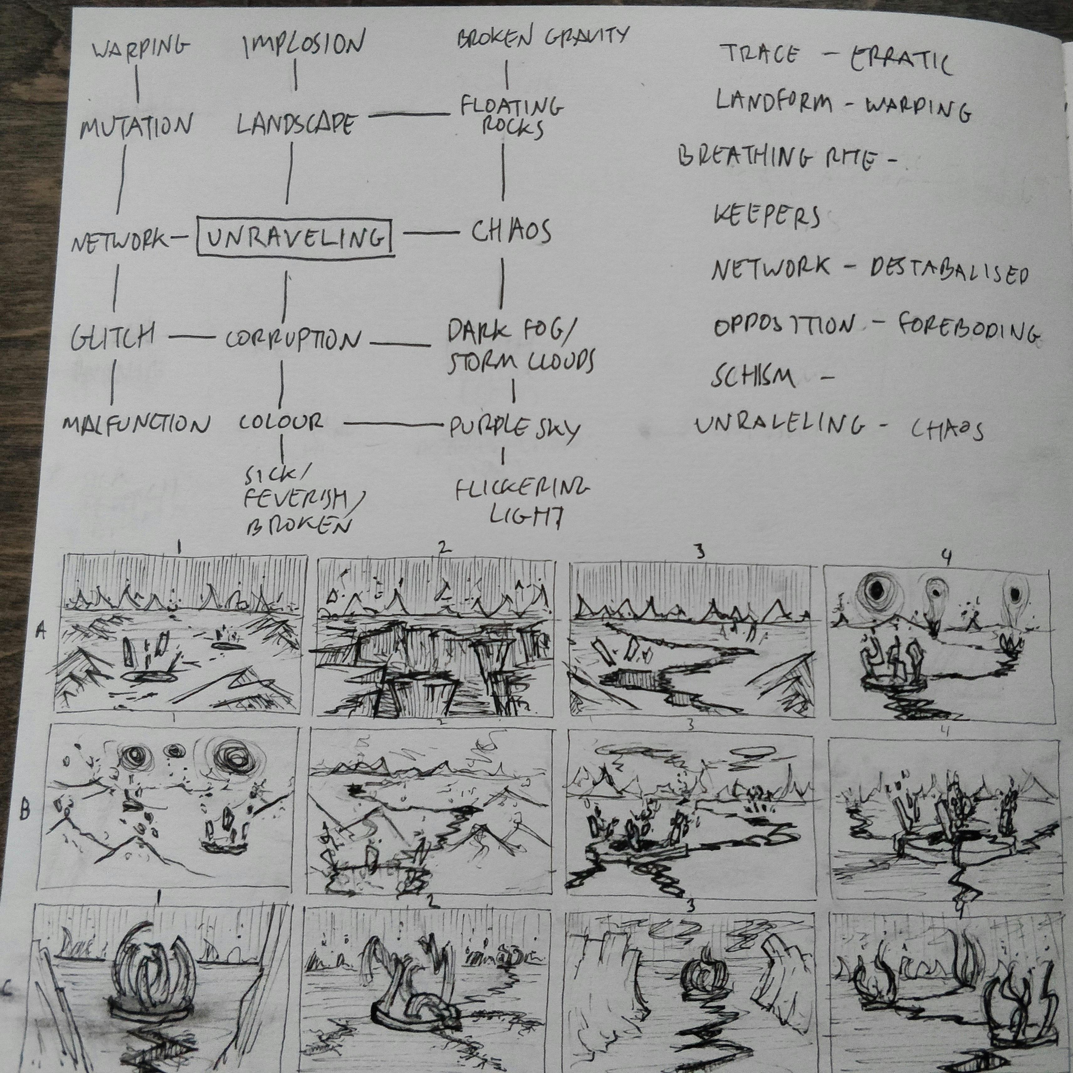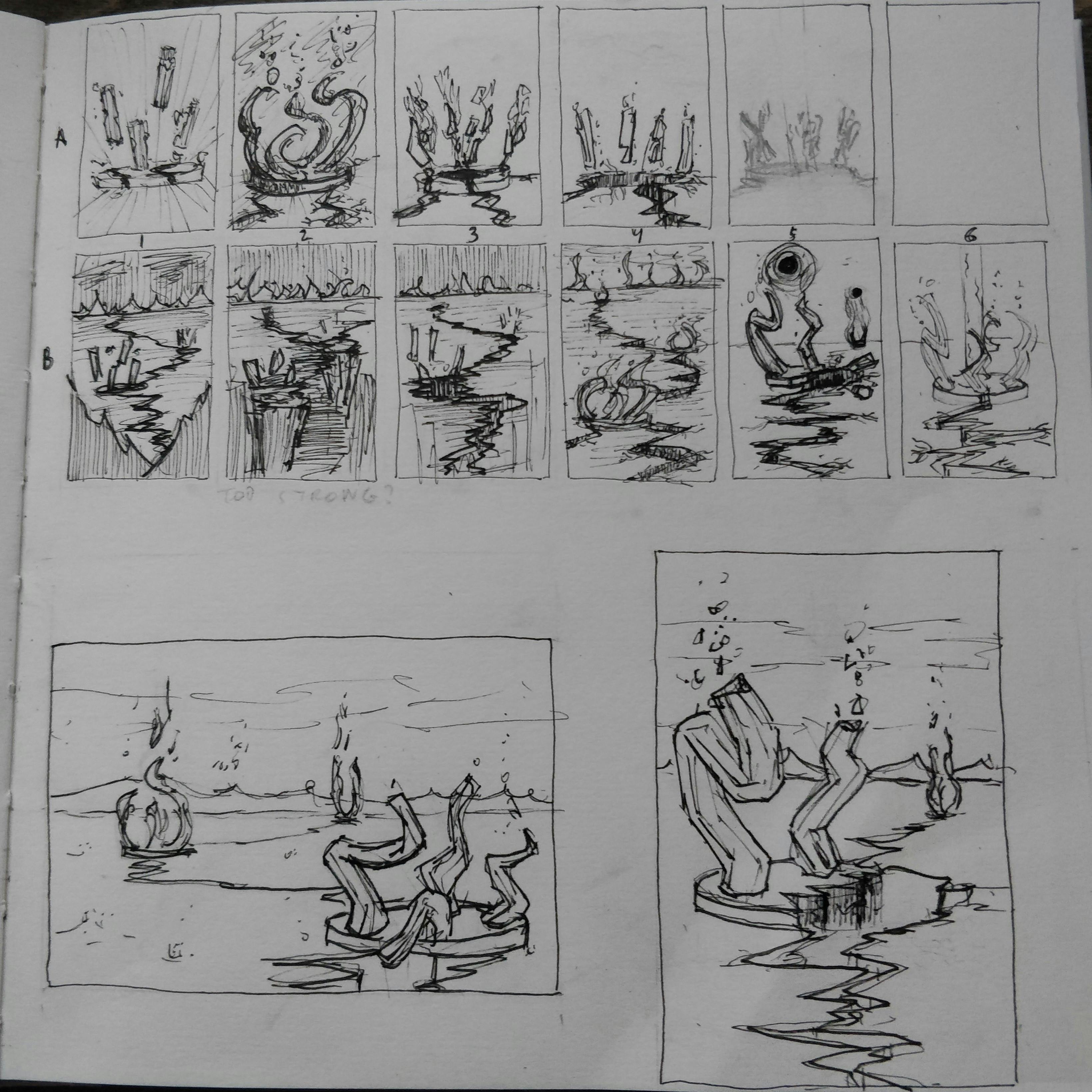 (La imagen final se creó mediante una combinación de bocetos tradicionales y pintura digital. Bocetos en miniatura a continuación)