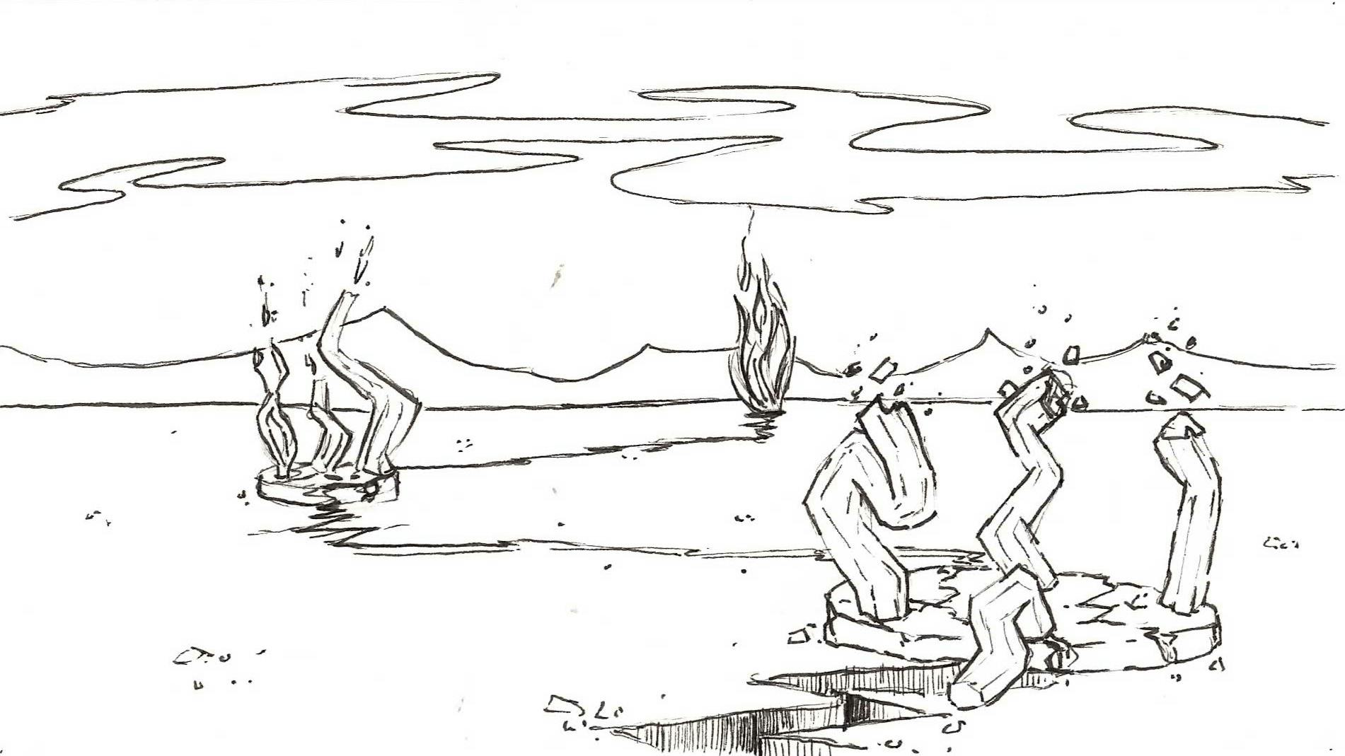 En respuesta, aparecieron enormes grietas entre los sitios conectados y la energía se derramó desde las profundidades de la Tierra. Los pilares se torcieron hasta adquirir formas inestables y los guardianes no pudieron detener la corrupción.