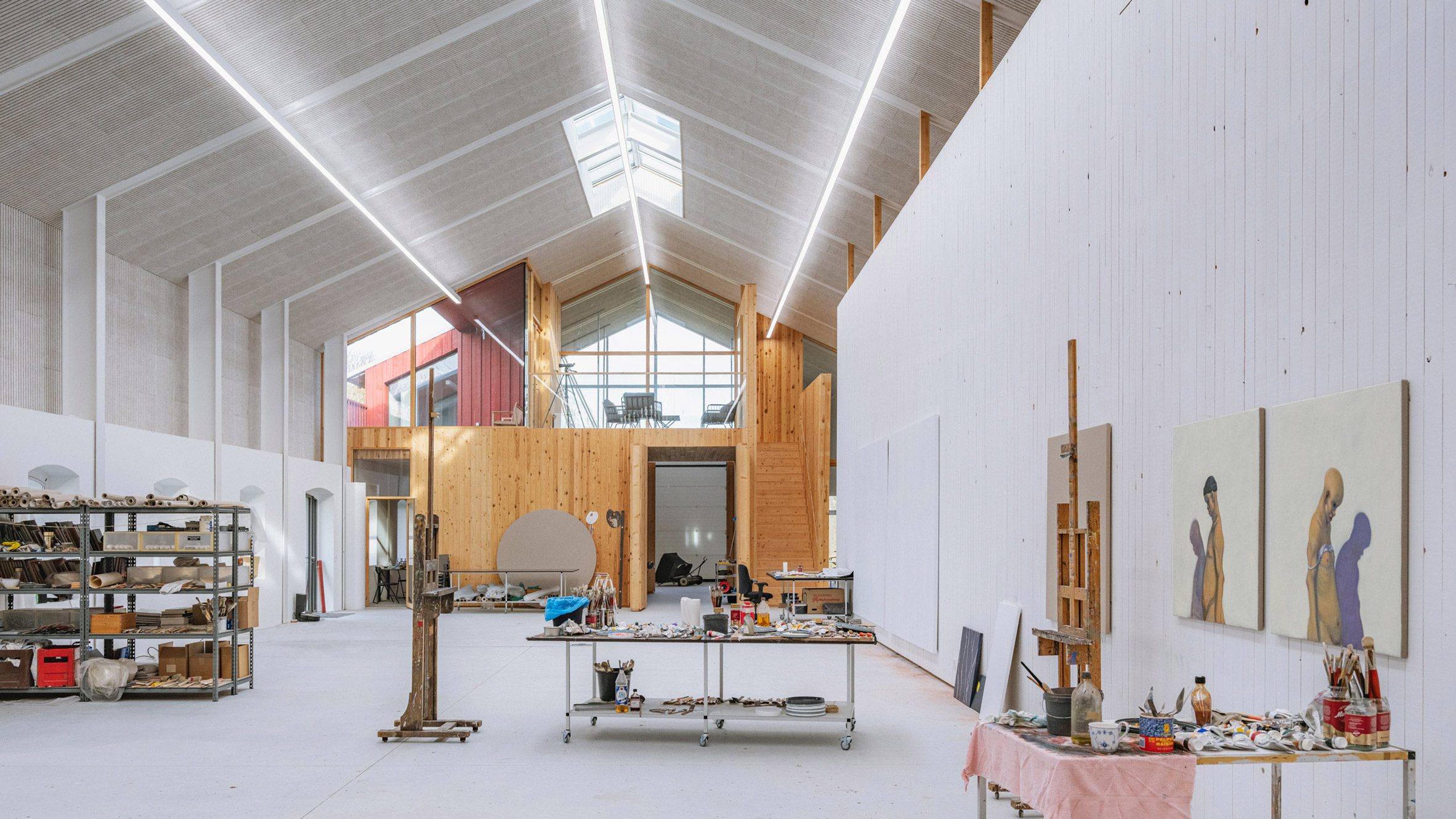 Las puertas anchas permiten mover fácilmente grandes lienzos dentro y fuera del estudio, mientras que las tiras de luz LED integradas en el techo brindan iluminación con calidad de luz natural cuando se trabaja de noche.