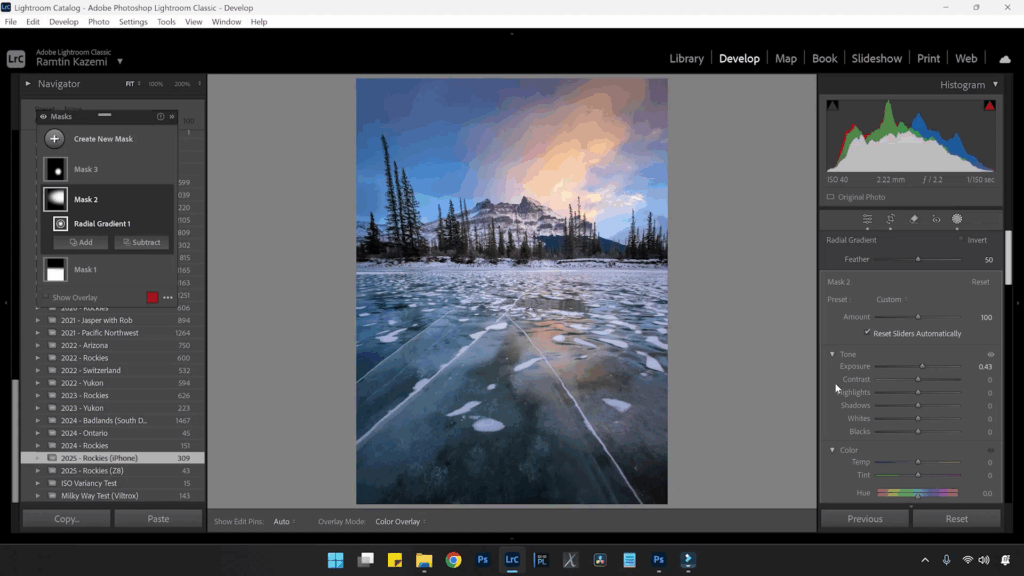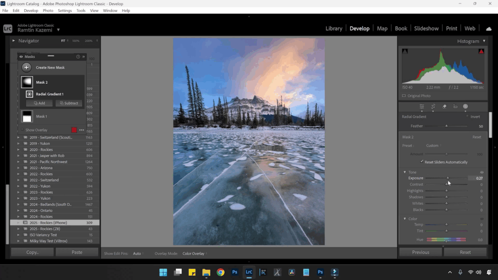Luego agregaré otro radial encima del cálido reflejo en el hielo y aumentaré un poco la saturación. Ahora, esa reflexión se hace evidente.