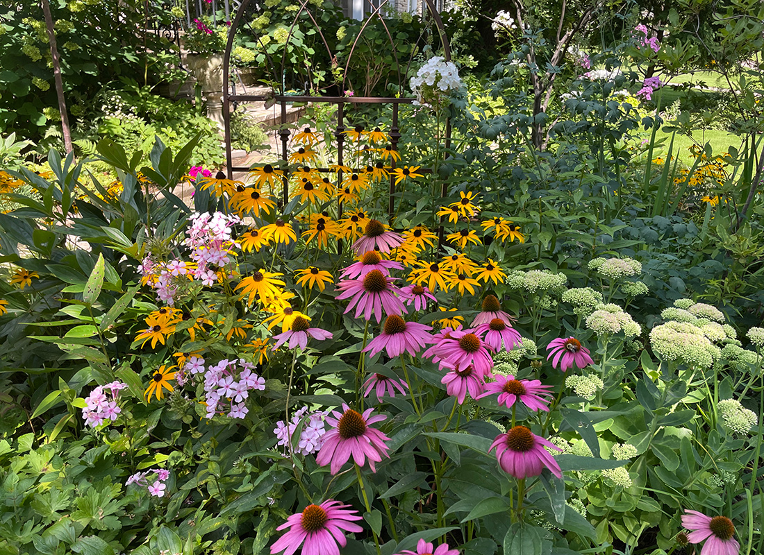 Flores amarillas y rosadas brillantes en el jardín de verano21 de agosto: Si bien el jardín siempre está colorido en agosto, empieza a verse un poco cansado, especialmente porque no cultivo plantas anuales. Aquí están los sospechosos habituales: equinácea, Equinácea, FloxSedum ‘Alegría de Otoño’ (pitahaya “Alegría de otoño”regiones 3–10) Un ligero rubor apenas comienza a aparecer.