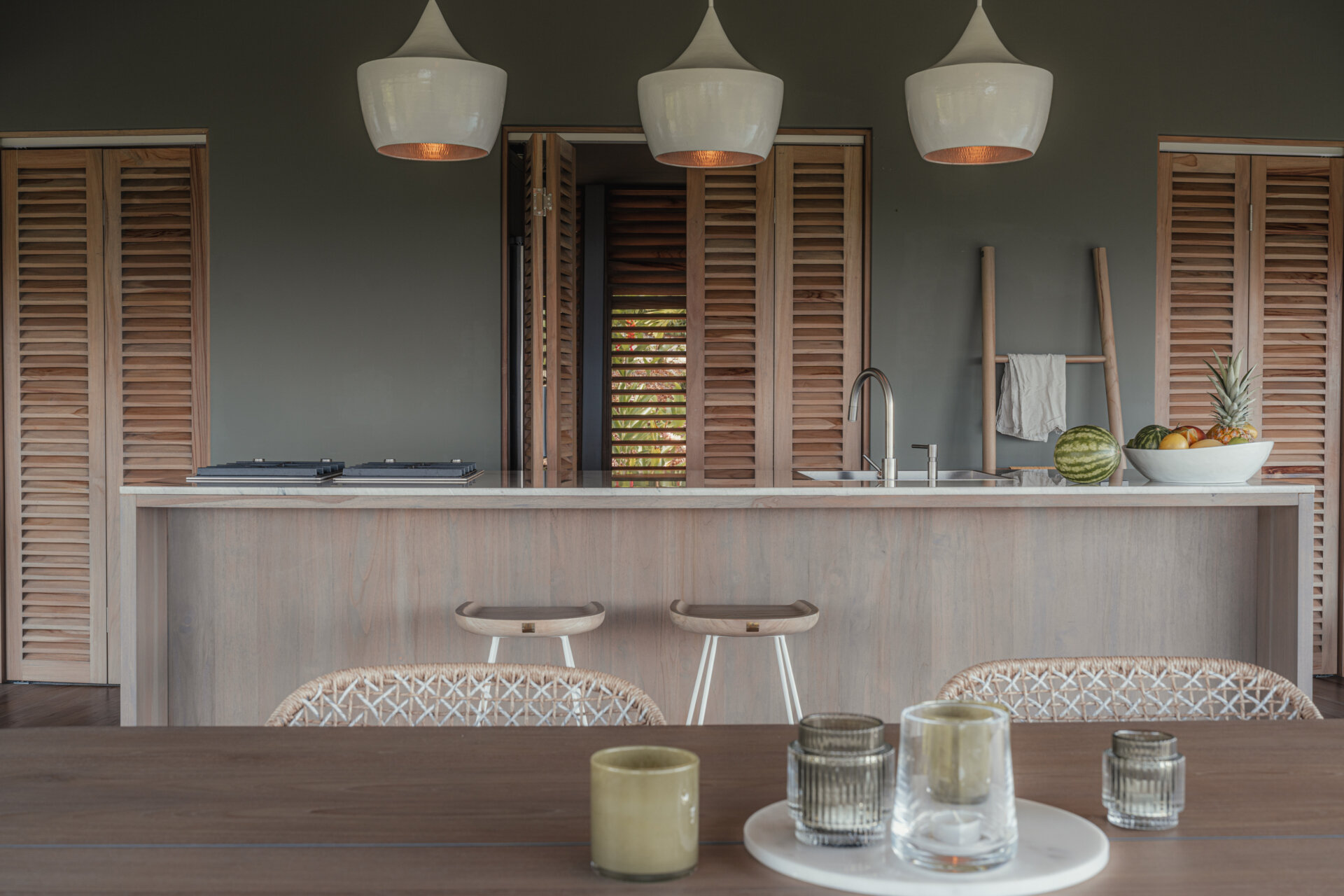 La cocina está ubicada dentro del mismo marco modular y tiene una isla larga de la que cuelgan tres luces colgantes, mientras que detrás de las puertas plegables se puede encontrar espacio de almacenamiento adicional.
