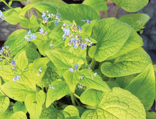 Una viñeta de llamar Rododendro ‘Medusa’ con hojas doradas (Rododendro “Medusa”zonas 7-9), y las hojas oscuras de ‘Britt Marie Crawford’ (Trichosantes “Britt María Crawford”regiones 4–8)