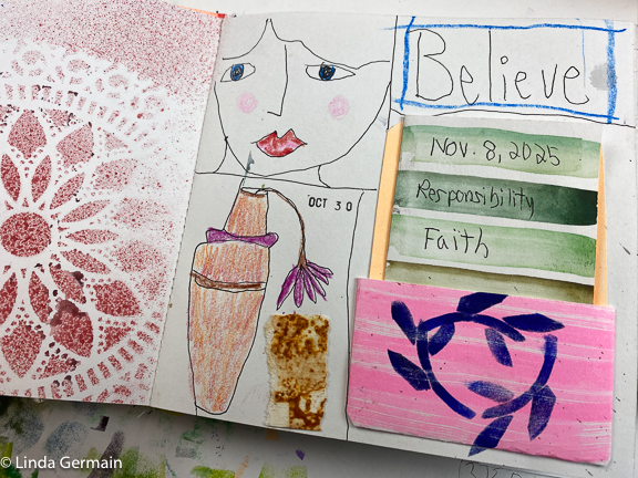 Mis herramientas favoritas en el proceso son marcadores muy simples, acuarelas, acrílicos, rotuladores, crayones, sellos caseros y recortes de revistas para collage. Así que te animo a que reúnas algunos materiales sencillos que probablemente ya tengas, pongas un cronómetro en 20 minutos y veas qué sucede en tu cuaderno de bocetos.