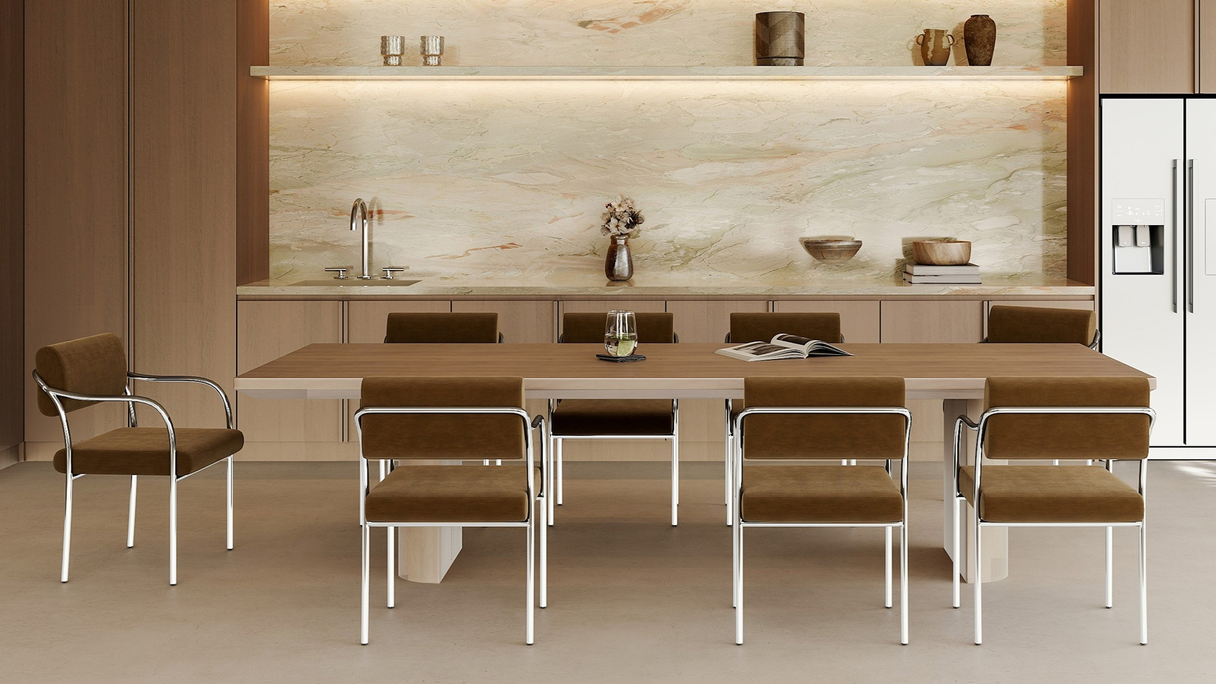La silla presenta una estructura tubular única de acero inoxidable que fluye y se curva para crear una estructura minimalista que brinda una sensación de ligereza.