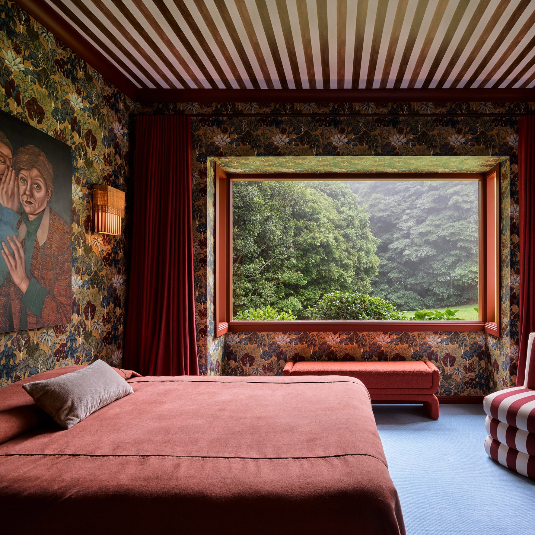 Muchas habitaciones del Hotel Plantasia están decoradas con papeles pintados estampados.