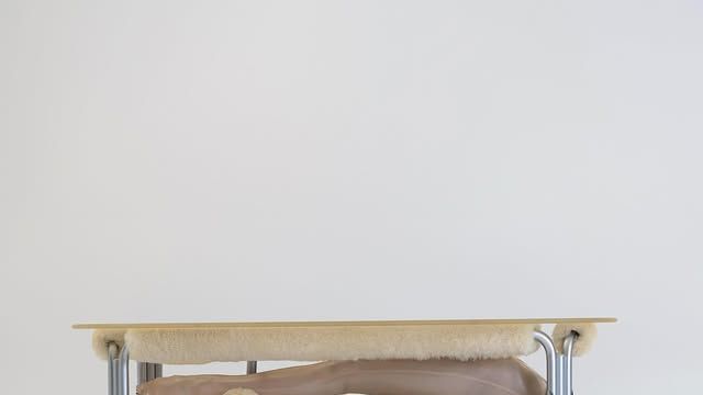 Otras obras representan figuras femeninas tragadas por sillones de masaje. 2012, Michael Bates Se diseñaron una serie de obras de arte funcionales: un sofá anudado, una casa plegable y una mesa de comedor con un arco obstructivo destinado a significar aislamiento.